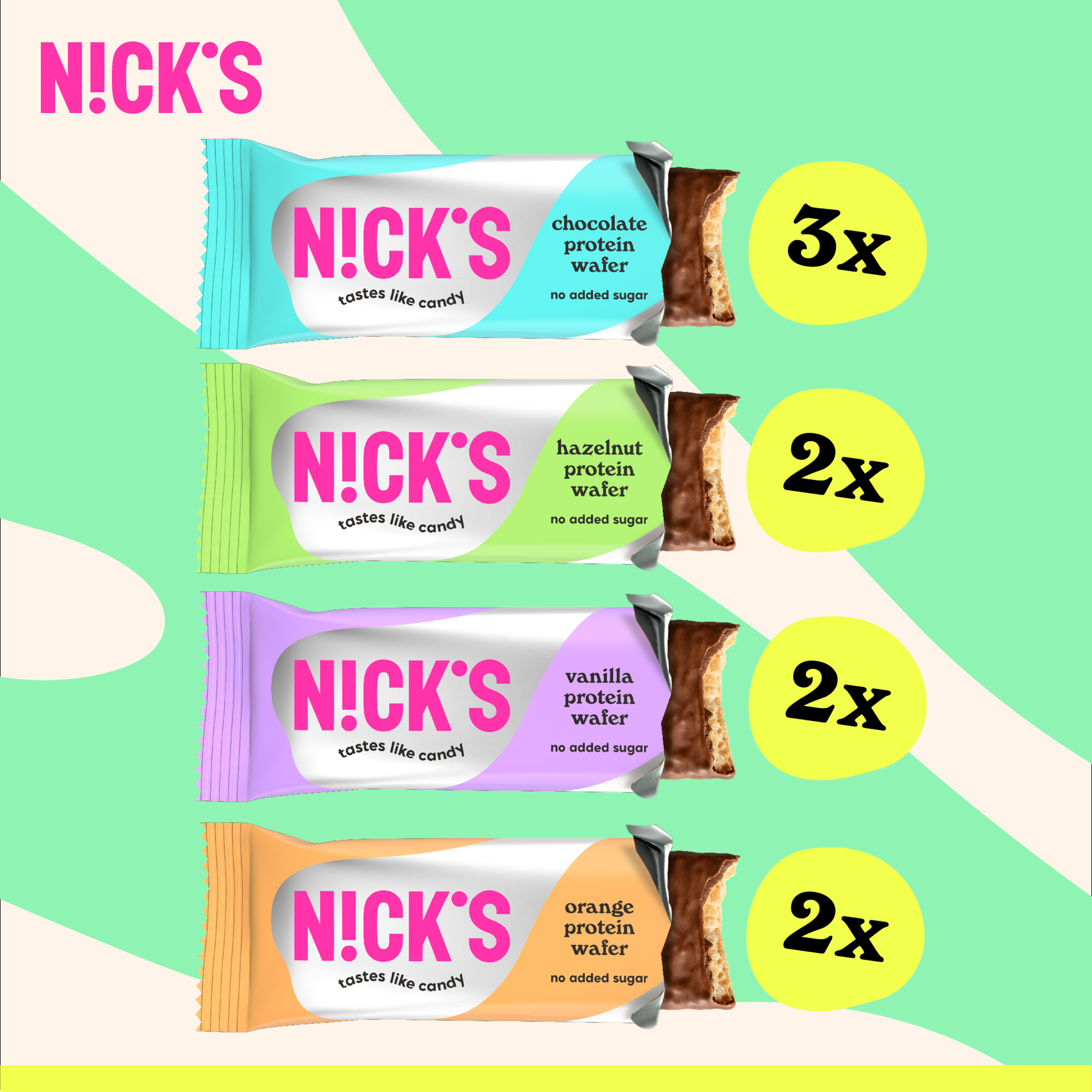 Die Box enthält eine Mischung unserer Proteinwafers: 3 Protein Wafer Chocolate, 2 Protein Wafer Hazelnut, 2 Protein Wafer Vanilla und 2 Protein Wafer Orange.