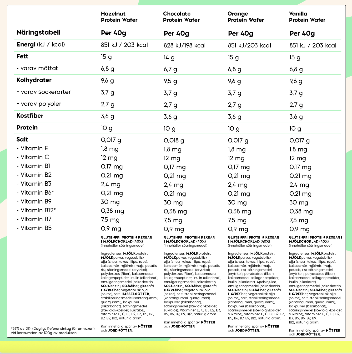 Unsere Proteinwafers sind glutenfrei und perfekt für eine Low-Carb-Diät, da sie keinen zugesetzten Zucker enthalten. Zudem sind die Proteinwafers mit 25 % Protein gefüllt, was sie zum idealen Snack macht, um dir den ganzen Tag über extra Energie zu geben.